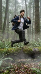 Create an ultra-realistic DSLR-style photo using the uploaded reference image as the main character. Face must remain 100% identical to the reference image (same hairstyle, beard, skin tone), no face swap or beautification photo size (2160×3840).An ultra-realistic, cinematic 8K action-style forest photograph capturing a lone traveler mid-motion as he steps or lightly jumps over a fallen log in a misty forest.